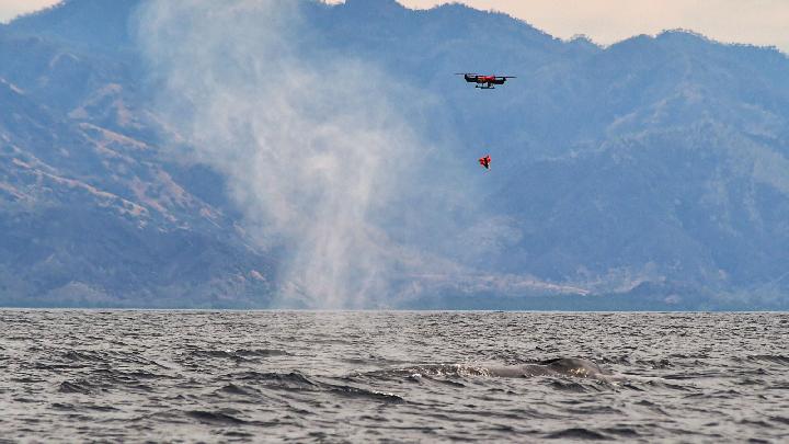 Ekspedisi Spesies Laut Bermigrasi oleh tim peneliti gabungan di Bentang Laut Sunda Kecil pada Oktober 2025. Ekspedisi melibatkan drone untuk memasang tag satelit pada paus. Dok. Konservasi Indonesia